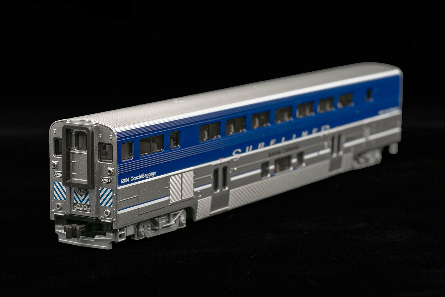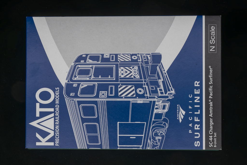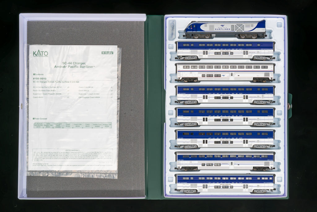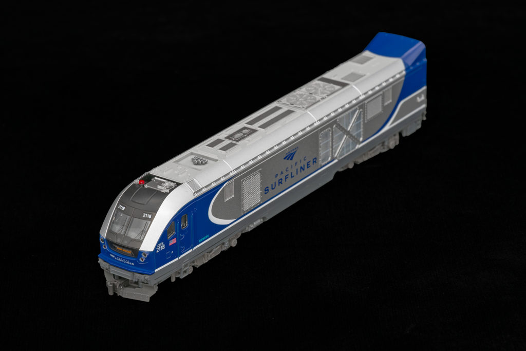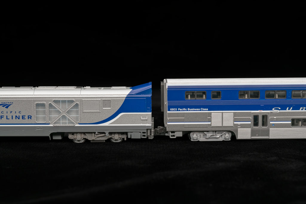 このKATOの編成の特徴でもある、サーフライナーとスーパーライナーの混合編成となっています。2号車にはアムトラック塗装のスーパーライナー、7号車にはパシフィック・サーフライナー塗装のスーパーライナーが連結されています。