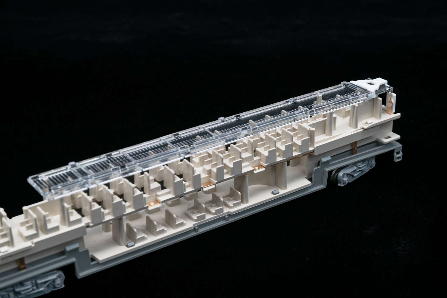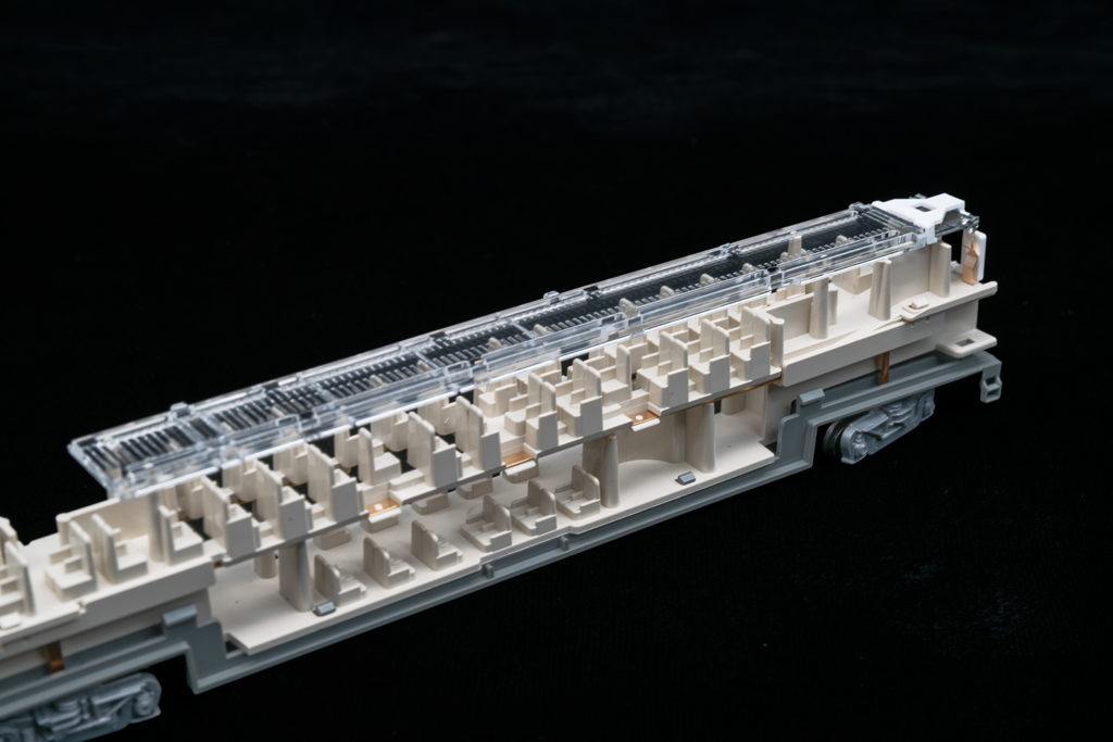 個人的に最大の好感度ポイント。スーパーライナーと違いサーフライナーでは室内灯のプリズムの保持が客席側で保持するKATOの現行の主流タイプになり、たぶんプリズムこの辺?と言うのが無くなって光が均一に回り易く、1階席まできちんと光が届きます。この編成に2両含まれるスーパーライナーは旧いままなので、光の回り方の違いがよくわかります。