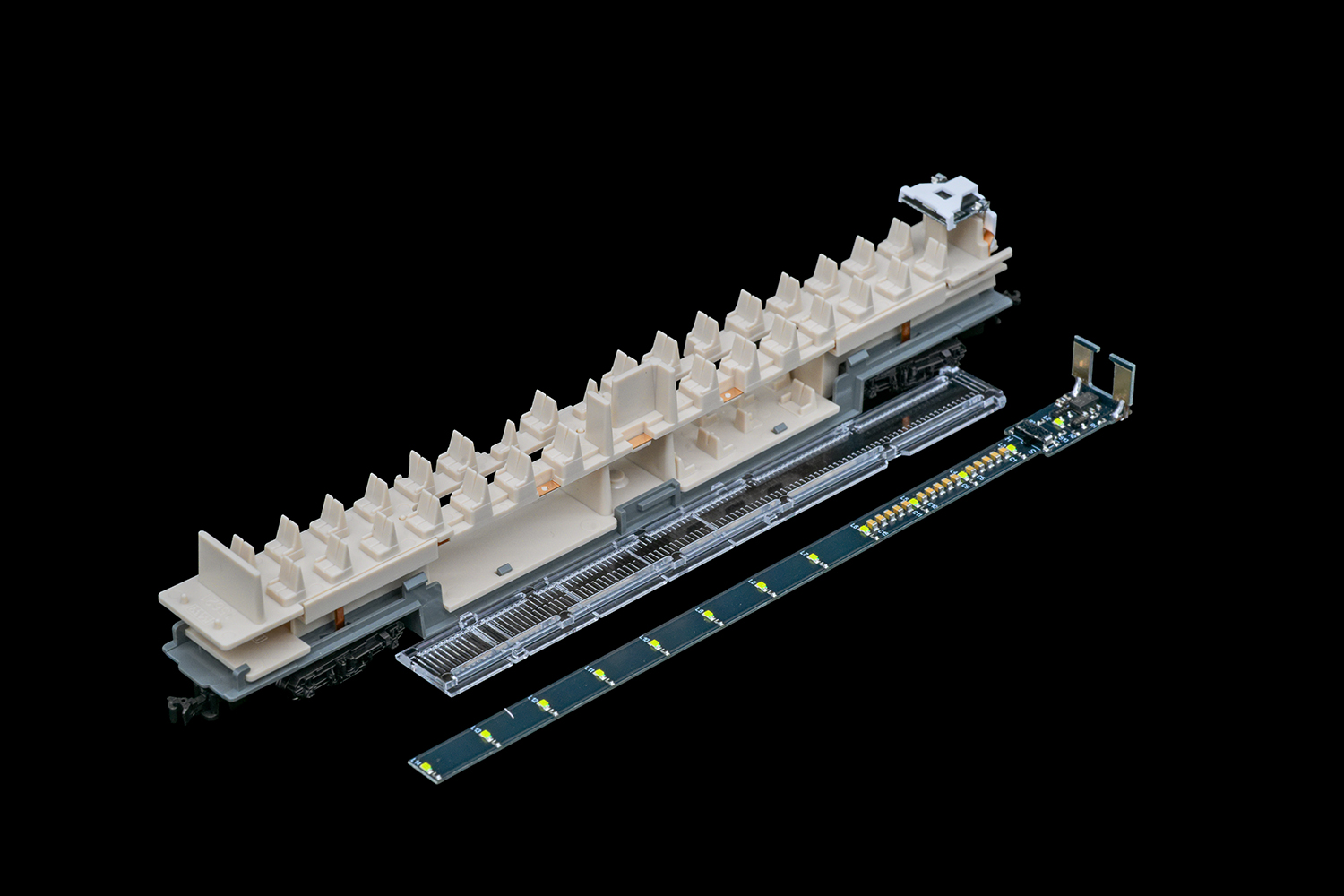 KATO純正室内灯との比較ですが、KATO製は車端部に配置された1灯のLEDからプリズムで導光する方式なのに対し、ポポンデッタ製はバー上に12灯のLEDが等間隔で配置されており、実車の蛍光灯のように真下を照らします。